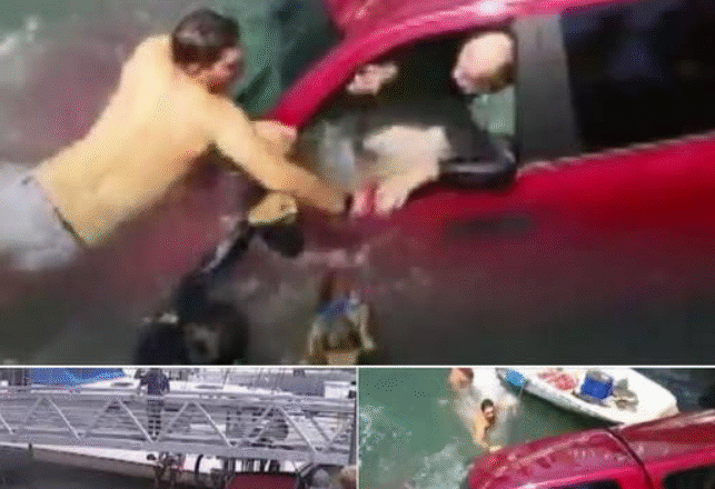 The incident was captured by a surveillance camera when the truck accidentally lunged forward – crashing into the railing of the nearby marina and plunging into the water.