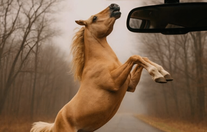 In front of me, reared up on its hind legs, stood the horse. It snorted, struck the asphalt with its hooves, and looked straight through the windshield as if it was trying to stop me. My heart was pounding so hard that I didn’t dare get out at first. But the horse clearly wasn’t going to run away — it was nervous and seemed to be trying to say something.