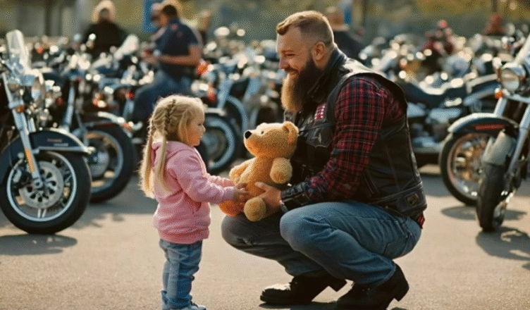 I stayed back and watched. She went straight to one of the bikers — the biggest one in the group. They exchanged a few words, and then I saw his face change. When she handed him her teddy bear, he knelt down… and started crying.