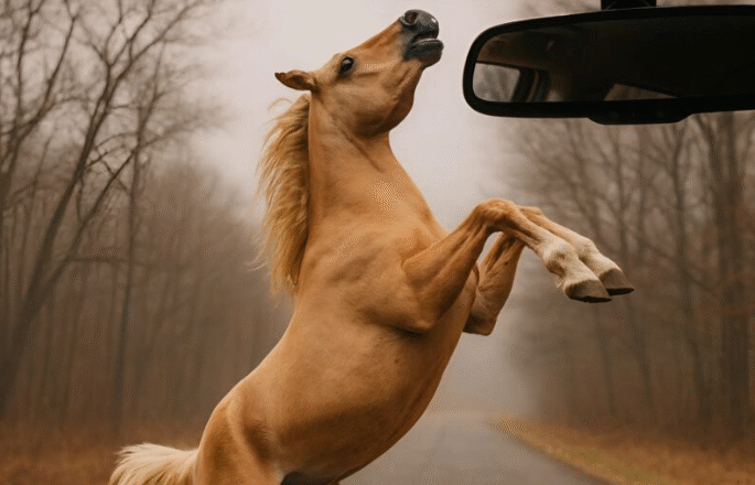 In front of me, reared up on its hind legs, stood the horse. It snorted, struck the asphalt with its hooves, and looked straight through the windshield as if it was trying to stop me. My heart was pounding so hard that I didn’t dare get out at first. But the horse clearly wasn’t going to run away — it was nervous and seemed to be trying to say something.