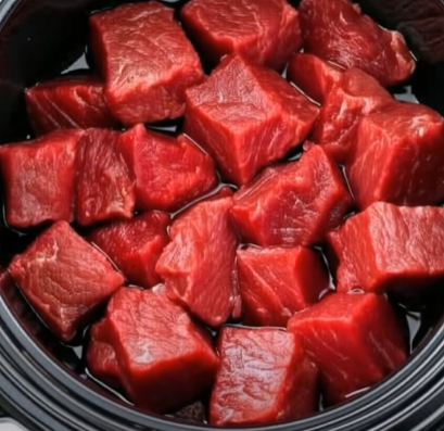 Start with one pound of beef stew meat, cut into even cubes like the ones shown in the photo. Place the meat in your slow cooker and add one can of cream of mushroom soup, one packet of onion soup mix, and one cup of sour cream. Stir gently until the beef is evenly coated in the creamy sauce. You can also add a splash of water or beef broth if you prefer a thinner consistency. Cover and cook on low for 6 to 8 hours, or high for about 4 hours, until the beef becomes tender and flavorful.
