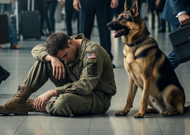 Long after their flight numbers were called and planes took off into the gray sky, the memory of Gate 14 clung to them. A soldier on the floor. A dog standing guard. A reminder that loyalty, in its truest form, is silent, steadfast, and utterly unbreakable