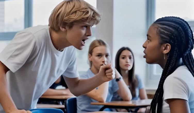 But today, something seemed different. Lucas, tall and strong, fixes her with an intense stare. After a heavy silence, he slams his pencil violently on the desk. “You don’t belong here,” he shouts, pointing at her.