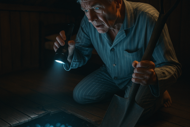 Around 3 a.m., flashlight in hand and courage barely intact, Harold pulled on his slippers and knelt beside the bed. He pressed his ear to the cold wooden boards — and froze.