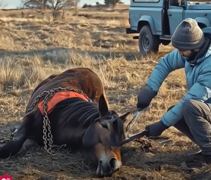 Then began an arduous task. Every link was welded with rust, every movement of the cutters felt like a battle. Between efforts, Ovidiu stroked the horse’s neck and spoke in a soothing voice: Just a little longer… freedom is so close.