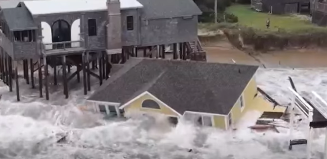 The homes, located along the fragile shoreline of Buxton, crumbled one after another as waves and storm surge battered the coast. The collapses weren’t isolated — several of the structures crashed into neighboring properties, amplifying the destruction and scattering debris across miles of beach.