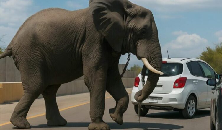 Under the scorching sun, traffic suddenly came to a halt. Drivers were honking, some leaning out of their windows — in the middle of the road stood a massive elephant. It flapped its ears nervously and suddenly struck a white car with its trunk. The bumper cracked, people panicked, tried to reverse, some screamed, others filmed everything on their phones.