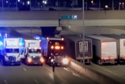 Trooper Shaw called on nearby truck drivers for assistance. Without hesitation, drivers began pulling their vehicles into position. One after another, thirteen massive tractor-trailers lined up beneath the bridge, stretching across multiple lanes of Interstate 696.