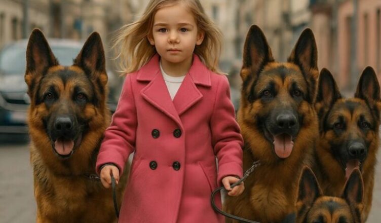 Every morning at seven o’clock, the same strange scene unfolded in a quiet neighborhood. A little girl, about five years old, walked confidently down the street with five huge German Shepherds on leashes.