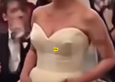 The guests laugh and cheer her on as she waits for someone to fetch the large, billowing skirt and train. Meanwhile, she revealed that a few nights earlier she “had a dream” that she did this exact thing.