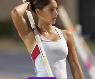 In the photo, her vaulting pole rested on her right shoulder, while she appeared to be adjusting her ponytail. Her spandex uniform, consisting of black shorts and a white tank top, typical for a track athlete, revealed a small portion of her midriff.