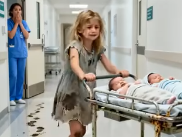 The sliding doors of the hospital hissed open as a barefoot seven year old girl staggered inside, her hands shaking as she pushed a rusty wheelbarrow across the polished floor.