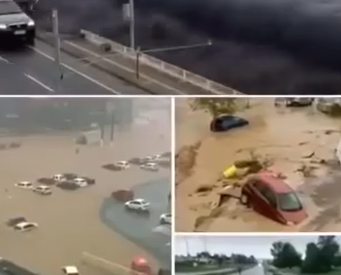 The water overflows at the parking lot in front of the building for a brief moment, then washes away all cars within the lot. The cars are tossed around by waves at the face of the building wall where evacuees stand, then jostle against one another like toys. In a blink of time, the waves gain height and white-capped turbid waters reach close to the rooftop.