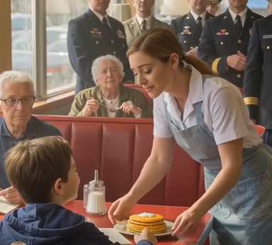 On the fifteenth morning, Jenny carried a plate of pancakes over to the booth. She placed it in front of him with a casual shrug. “Oh, I’m sorry,” she said. “The kitchen made an extra. Better you eat it than have it wasted.” The boy looked up then. His dark eyes widened faintly, as though surprised by kindness. She walked away without pressing further. Ten minutes later, when she returned, the plate was clean—every pancake gone.