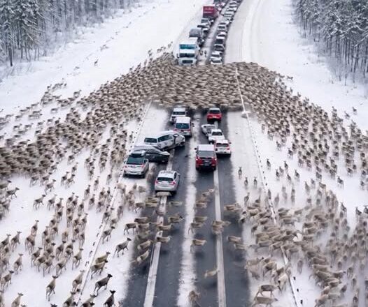 Hundreds of deer streamed across the road, antlers catching the pale winter light, hooves tapping softly against frozen asphalt. Children laughed. Phones were raised. Photos and videos flooded social media within minutes, tagged with phrases like “holiday magic” and “nature’s parade.” Traffic came to a complete standstill, but no one complained. No one honked. Everyone watched.