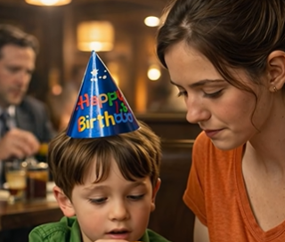 The lights in the restaurant dimmed, and a birthday cake with candles was slowly carried to their table.