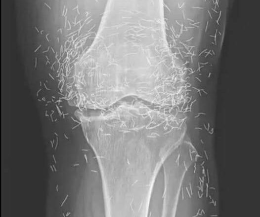 Years later, when doctors took X-rays to evaluate her knee condition, they weren’t prepared for what appeared on the images. Her knees were filled with dozens of bright, metallic flecks — tiny needles embedded deep within the joint area.