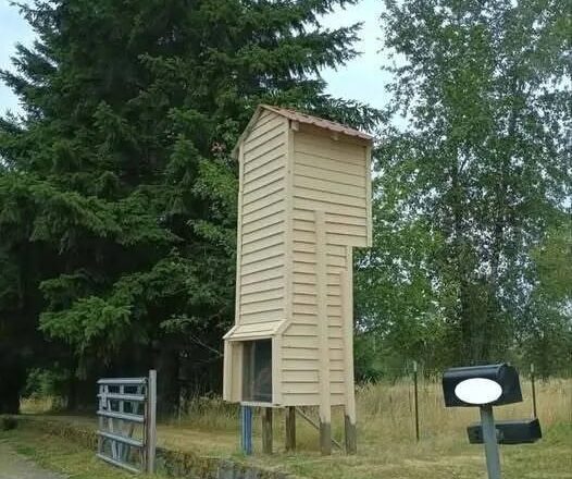 Strangers slam their brakes when they see it. A skinny beige tower, fifteen feet tall, looms at the edge of a quiet driveway, staring back at the road like a mute guardian. Its plain wooden frame, streaked with sunlight and weathered by seasons, carries an almost human presence.