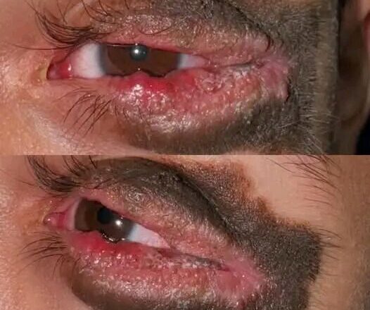- : Causes irritation and crusting around eyelashes